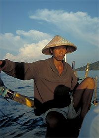 Mit dem Prahu - der kleinen Auslegerboot-Variante - schippern wir auch mal die Küste entlang zu anderen Riffs, in tiefere Gewässer und an das Wrack eines Fischerbootes, das sich innerhalb weniger Jahre in ein intaktes, von zahllosen Lebewesen bewohntes Riff verwandelt hat. In noch sonnendurchfluteten vier Metern Tiefe überwuchern rote, gelbliche, blaue und vereinzelt sogar schwarze Korallen Deck und Reeling. Riesige Fischschwärme tummeln sich hier, unter anderem auch eine der hoch giftigen schwarzweiß geringelten Seeschlangen, ein Plattschwanz. Gefangen vom Zauber dieses Szenarios verlieren wir jegliches Zeitgefühl und steigen erst wieder ins Boot zurück, als unser Fischer uns mit Nachdruck dazu auffordert. Unser Sonnenbrand am nächsten Tag ist nicht von Pappe.
