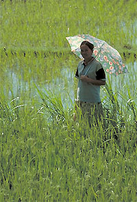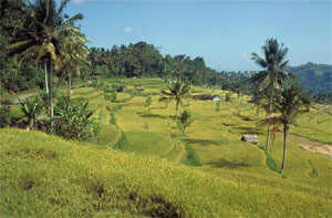 Gerne hätten wir eine Fahrt an der Küstenstraße rund um die Osthalbinsel unternommen. Aber seit dem letzten heftigen Ausbruch des Agung im Jahre 1963 ist sie in sehr schlechtem Zustand, und unser Fahrer bevorzugt die Strecke durchs Inland. Hinter Amed schlängeln wir uns einen Pass hinauf und genießen wundervolle Einblicke in weite Gebirgstäler, auf satt grüne Hügel und mit Reisfeldern überzogene Bergflanken.