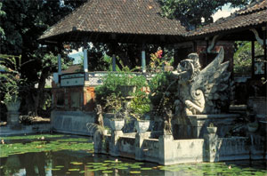 Ziel der Fahrt ist die Bezirkshauptstadt Amlapura und Puri Agung Kanginan, dem noch bis 1935 vom letzten Raja und bis heute von einem Teil seiner Angehörigen bewohnten Palast. Nach Passieren zweier wadenschnappenden Gänse wandeln wir im Schatten einer zauberhaften Gartenanlage vorbei an Lotosteichen und Springbrunnen zum Hauptpalast, wo wir - hier unerwartet - eher schlichte Wohnräume vorfinden und ein überdimensionales Schwarzweißfoto der zuletzt amtierenden Raja-Familie bestaunen können.