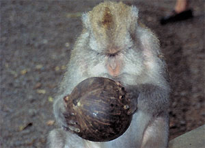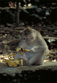 Selbstverständlich können wir uns - allen Warnungen zum Trotz - nicht verkneifen, am Eingang eine der riesigen und zu Wucherpreisen angebotenen Bananenstauden zu erstehen. Kaum haben wir einen Fuß über die Schwelle des Eingangstors gesetzt, greift sich ein dicker, großer Affe den kompletten Sack Bananen. Wir überlassen ihm kampflos die Beute, mit so einem Gesellen legen wir uns lieber nicht an. Mit einem Fuß die Staude gesichert, beginnt er sofort, genüsslich eine Banane nach der anderen in sich hineinzustopfen. Ja, das warīs dann wohl mit Füttern...