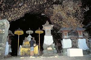 Sich für Candi Dasa mit seinem winzigen Strandstreifen und den monströsen Betonstützmauern zum Schutz der Häuser gegen Brandung zu begeistern, fällt schwer. Als sehr sehenswert entpuppt sich dagegen Goa Lawah. Der Tempel am Eingang einer riesigen Höhle ist deren Einwohnern geweiht, Tausenden von kleinen Flughunden. In dicken Trauben hängen sie an Felsvorsprüngen, von der Decke und schwirren lautlos zwischen den Wänden des dunklen Gewölbes umher. Fasziniert beobachten wir einen Python in der Höhlenwand, der - bereits mit drei verdächtig dicken Auswölbungen am Körper - sein nächstes Opfer umklammert.