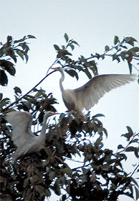 Vier Kilometer von Ubud entfernt liegt das kleine Dorf Petulu, wo sich bei Einbruch der Dunkelheit Tausende weißer Reiher zur Nachtruhe sammeln. Dieses Spektakel wollen wir nicht versäumen. Als wir kurz vor Sonnenuntergang eintreffen, weist lediglich die mit Kot übersäte Straße auf eine Präsenz von Vögeln hin. Und dann treffen sie langsam ein: die ersten vereinzelt, bald darauf ganze Schwärme. Laubbäume scheinen die beliebtere Bleibe zu sein. Erst bis alle Kronen voll besetzt sind, werden die Palmen angeflogen. Lautes Gekrächze, Streit um die bequemeren Äste, ein permanentes Schwirren und Geflatter. Als wir uns bei einbrechender Dunkelheit auf den Heimweg machen, fliegen immer noch Scharen der langbeinigen Vögel ein. Ein faszinierendes Schauspiel!