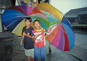 Besaki auch nennt, scheint uns wohl gesonnen: Wir können die riesige und beeindruckende Anlage an der Flanke des Agung in aller Ruhe bewundern ohne einen Regentropfen abzubekommen. Sauer wird Mutter allerdings, als wir den Weg zum einen Kilometer unterhalb des Tempels gelegenen Parkplatzes antreten. Alle Schleusen des Himmels tun sich urplötzlich auf, innerhalb von Sekunden sind wir nass bis auf die Haut und flüchten unter das Vordach des nächstbesten Hauses. Die steile Straße verwandelt sich vor unseren Augen in einen reißenden Sturzbach, und die kleinen Läden gegenüber sind hinter dem Wasserfall von Regenguss kaum noch zu sehen. Eine kleine Gestalt mit Riesen-Regenschirm kämpft sich zu uns durch. Für ein paar Rupies bietet uns ein Knirps Schutz hinunter zum Auto an. Nach zähen Verhandlungen, vergeblichem halbstündigen Warten auf Wetterbesserung und plötzlich aufgetauchtem zusätzlichem Beleitschutz, dem kleinen Bruder mit zweitem Regenschirm, sind wir weich geklopft und nehmen das Angebot an. Zu solch ausdauernden, geschäftstüchtigen Kerlchen können wir einfach nicht nein sagen.