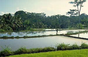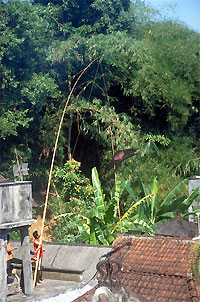 beginnen zu schmerzen, da hören wir in der Ferne das Rauschen eines offenbar größeren Flusses. Das muss der Yeh Ayung sein. Unser Pfad endet jäh an einem Steilabfall. Durch ein paar lichte Stellen des dichten Pflanzenbewuchses können wir zumindest einen Ausschnitt des herrlichen Tals erkennen: einen Palmenwald, Reisterrassen - und eine weit entfernte Brücke (die dritte offenbar). Auf der Suche nach einer Abstiegsmöglichkeit stoßen wir verdächtig oft auf abgestoßene Schlangenhäute. Da es ohnehin so aussieht, als würden wir von hier aus nie den Fluss erreichen, beschließen wir nach Hause zurückzukehren. Gottlob liegt bei Verlassen des Wäldchens direkt die Ortschaft Sayan vor uns. Entlang der Teerstraße, die auch auf unserer Karte eingezeichnet ist, finden wir nach Ubud zurück. Die mit frischem Tee gefüllte Thermonskanne auf unserer Terrasse lernen wir spätestens ab heute schätzen.