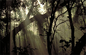 Dichte Baumriesen tauchen das Wäldchen in permanent dämmriges Zwielicht, nur vereinzelt durchbrechen Sonnenstrahlen das Geäst. Tempel, dunkle Teiche und steinerne, mit Moos überwucherte Dämonen entlang verschlungener Pfade verstärken noch das Gefühl, durch einen verwunschenen Wald zu laufen. An einer Stelle führt der Weg mitten durch den mächtigen Stamm eines Banyan-Baums hindurch.