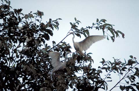 Petulus weiße Reiher beim Kampf um die besten Schlafplätze