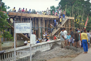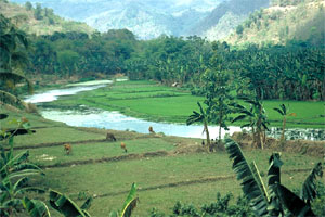 Von unerwartet zauberhafter Seite zeigt sich die Insel, hat man die letzten Häuser von Bima hinter sich gelassen. Vorbei an Reisfeldern, über dicht bewaldete Hügel bis an einen sich sanft durch ein weites Tal schlängelnden Fluss führt unser Weg. Vom Anblick dieses verzaubert wirkenden Ortes in unwirklich leuchtendem Grün können wir uns lange nicht losreißen. Man möchte sich am liebsten einfach in diese Landschaft hineinfallen lassen.