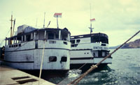 Das Schiff von Komodo nach Sape benötigt einen guten halben Tag und ist restlos überladen. Die in einem freigeschaufelten Eck, der "Bordbar", angebotenen Sandwiches verkneifen wir uns lieber, und für zwei Pappbecher Kaffee stehen wir eine halbe Stunde in einem unsäglichen Gewimmel von Menschen an. Im Hafen kaum von Bord, fallen zahlreiche Busfahrer über die Passagiere her und scheuchen alle in die wartenden Fahrzeuge. Wir nehmen an, dass jeder Bus nach Bima fährt - etwas anderes gibt es hier eh`nicht. Eingequetscht zwischen