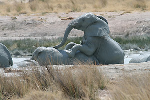 etliche Babys, baden, wälzen sich in Schlamm und Wasser, spritzen, trinken und trompeten lautstark. Einige Zebras und Springböcke stehen etwas abseits.