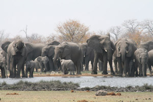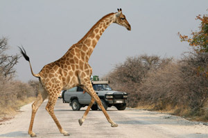 Wir sind auf dem Weg zum Chudob-Wasserloch. Ein Freund hatte mal gemeint, dass es eigentlich genügen würde, den ganzen Tag einfach nur an einer solchen Stelle zu verweilen - die Tiere kämen dann schon alle. Recht hatte er. Was hier geboten ist, übertrifft wirklich alles, was wir bisher erlebt haben. Giraffen, Elefanten, Perlhühner, Zebras,
