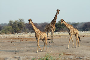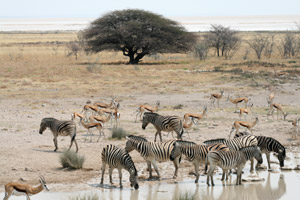 zugunsten von Homelands und erneuten Erweiterungen heute 22.000. Seinen Mittelpunkt bildet eine riesige Salz-Ton-Pfanne, die nach ausgiebigen Regenperioden von etlichen Zuflüssen gespeist wird und sich in einen immensen See verwandeln kann. In der Trockenzeit, wenn das Wasser verdunstet ist und die im feuchten Boden gelösten Mineralien sich abgesetzt haben, entsteht dort eine rissige Salzkruste. Für die Tiere also ein Anziehungspunkt zu jeder Jahreszeit. Im Gegensatz zum üppigen, mit Flüssen durchzogenen Krügerpark in Südafrika ist Etoscha ein karg