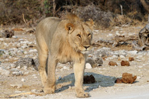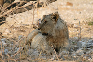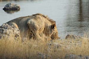 An der Teerstraße bremst vor uns ein Reisebus. Köpfe, Ferngläser und Kameras hängen links aus den Fenstern - hier gibt's offenbar etwas besonders Interessantes zu sehen. Für uns nicht, wir sind zu weit unten und gucken nur in staubiges Dickicht. Gespannt warten wir ab. Dann schlendert ein junges Löwenmännchen vorm Bus vorbei, über die Straße und genau in Richtung des Wasserlochs, von dem wir kommen. Nichts wie Gang rein und hin - ebenso der Bus. Dank unseres platzsparenden Fahrzeugs können wir uns einen Tribünenplatz für den Auftritt sichern. Der Löwe kommt tatsächlich. Nach einer Rast unter einem etwa fünf Meter entfernten Busch - wahrscheinlich stehen wir genau auf seinem Trampelpfad - begibt er sich gemächlich ans Wasser.