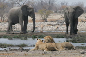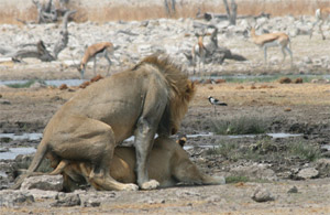 Giraffen, Herden von Zebras, Gnus sowie anderen großen und Kleinst-Antilopen. Unseren Schakal gleich bei Namutoni sehen wir auch wieder. Heute buddelt er an seinem Bau herum. Nach einem ausgiebigen Besuch des stets lohnenden Chudob machen wir uns auf zum Wasserloch Rietfontein, wo gestern unsere beiden Co-Teams Löwen bei der Paarung beobachten konnten. Da sich diese Großkatzen für die Zeugung des Nachwuchses etliche Tage Zeit nehmen und das vorzugsweise an der gleichen Stelle, rechnen wir uns