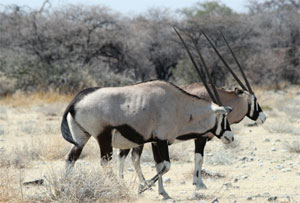 vor dem Wärterhäuschen postieren. Im Häuschen erhalten wir unser Dreitage-Permit, bezahlt wird sechs Kilometer weiter im Fort Namutoni. Das Namibia-Team, das sich schon extra früh auf die Pirsch begeben wollte, steht etwas verloren vor dem Office. Das Scheckkarten-Lesegerät funktioniert nicht, Bargeld haben sie nach dem Volltanken nicht mehr ausreichend dabei - sie kommen nicht in den Park. Wir legen zusammen, und das Abenteuer kann beginnen.