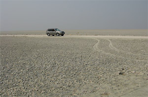 In die "Pfanne" hineinfahren kann man vom Südufer aus - allerdings nur ein paar Hundert Meter weit. Eine unendliche flache, dürre und verkrustete Ebene liegt vor uns, kein Horizont im Norden zu sehen, nur schemenhaft hebt sich das