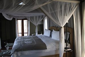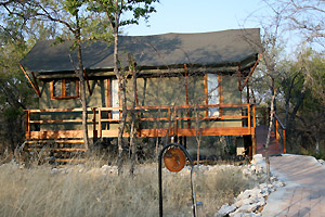 Camp-Feeling stellt sich hier auch ein. Die einzelnen Zelte - eigentlich sind es Blockhütten unter einem Zelt und auf Stelzen - liegen großzügig verstreut zwischen dichter Buschvegetation, direkt vor unserer Terrasse ziehen Buschböcke vorbei, Zebramangusten tollen zwischen umgestürzten Baumstämmen umher, Lärmvögel, die grauen Loris, schimpfen von den Ästen. Ein Wasserloch