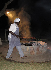 Heute gibt es Braii. Bedauern wird von manch kritischer Seite ausgesprochen ob des zu lange gegrillten Kudus. Und schmeckt es hervorragend. Nach Vertreiben einer unbekannten, überdimensionalen Spinne in unserem Zimmer lassen wir uns mit unserer Weinflasche auf zwei gemütlichen Liegen nieder, etwas abseits an einer lauschigen Stelle unter einem Baum, vor uns die Weite des Busches, kein Zaun, nur die Geräusche der Nacht. Erst als wir den alten Wachhund neben uns wahrnehmen - in Habachtstellung und mit aufgestellten Lauschern, den Blick in die Finsternis gerichtet - hören wir nicht weit entfernt ein Scharren, Schnaufen und andere undefinierbare Tierlaute. Womöglich eine von den vielen Hyänen, die hier angeblich herumlaufen. Wir stehen auf und trinken unseren Wein auf der Restaurant-Terrasse aus.