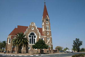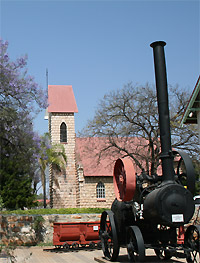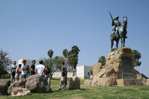 Nach einem ausgiebigen Provianteinkauf für die kommenden Tage "abseits der Zivilisation" bleibt nur kurze Zeit, um die Landesmetropole zu erkunden. So beschränken wir uns auf die bekanntesten Sehenswürdigkeiten: die Christuskirche und das martialische Reiterdenkmal nebenan, das an die während der Herero- und Nama-Aufstände gefallenen deutschen Schutztruppler erinnert. Besser gefallen Linda die beiden Himba-Frauen, die auf unsere kleine Gruppe zueilen. Während sie sich zu Füßen des Südwesterreiters postieren, fordern sie zehn Rand pro Person für ein Foto. Grimmig verlangt eine Hübsche nach dem "Shooting" von Linda eine Extra-Gage wegen mehrfachen Ablichtens. Heidi löst den kleinen Konflikt souverän mit einem leicht aufgerundeten Sammel-Honorar.