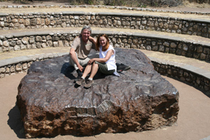 Vor 80.000 Jahren herabgefallen, fast 60 Tonnen schwer, liegt der Eisen-Nickel-Koloss heute sehr fotogen eingebettet in eine Art Amphitheater und erinnert irgendwie an ein Kudu-Steak. Er ist der größte jemals auf unserem Planeten gefundene Meteorit und hat sich damit einen Platz im Guiness-Buch der Rekorde gesichert. Es ist schon ein ganz hübscher Brocken - klar, dass jeder da mal raufklettert für ein "gemeinsames" Foto.