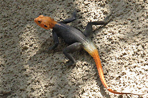 quäkenden grauen Loris und machen Bekanntschaft mit den prachtvoll gefärbten Namibia-Agamen, die an unserer Hauswand umherturnen.