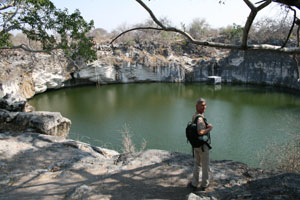 Letzte Station der heutigen Etappe ist der Ojikoto-See, eine Rarität - außer ihm gibt es nur noch einen weiteren natürlichen See in Namibia, den nahegelegenen Lake Guineas. Kreisrund, im Einsturzloch einer Höhle, 100 Meter tief, versorgt er heute die Landwirtschaft rund um Tsumeb. Zur Blütezeit des Bergbaus diente er den Minen als Wasserlieferant, im Ersten