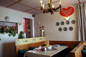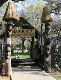 einfach gegenüber dem Bohrturm der alten Kupfermine. Da kommen sie am ehesten vorbei. Nicht lange und unsere Weggefährten treffen im Konvoi ein. Man hat unterwegs beschlossen, im berühmten Etoscha-Cafe ein Päuschen einzulegen. Unsere Intuition war zwar in Bezug auf den Bohrturm nicht ganz richtig, aber unser Auto steht direkt vor besagtem Cafe. An einer altdeutschen, postkartenkitschigen Stube inklusive Stammtisch und Zubehör vorbei geht's in den "Biergarten", tropisch, mit blühenden Pflanzen zugewuchert, hängende Blumentöpfe überall - schattig und sehr gemütlich. Der von fast allen georderte Leberkäs-Toast schmeckt