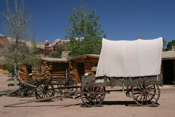 Vor unserer Abreise nach Mesa Verde minimieren wir so gut es geht die dicke rote Sandschicht von und aus unserem Auto, das Hinweisschild im Bad befolgend, nicht die Handtücher zur Autowäsche zu benützen, sondern sich im Büro Lappen zu besorgen. Da heute reichlich Zeit ist bei knappen 250 Kilometern nach Cortez, schlängeln wir uns zunächst gemütlich den San Juan entlang bis Bluff. Ganz nett und genau richtig, um sich die Beine zu vertreten, ist der Besuch des dortigen Pionier-Museums mit Holzhütten, City Hall und Planwagen, mit denen im 19. Jahrhundert eine Handvoll kühner Siedler den Weg über einen Pass und durch einen engen Felsspalt hierher gefunden hat.
