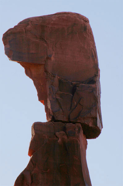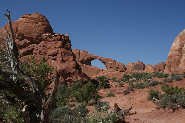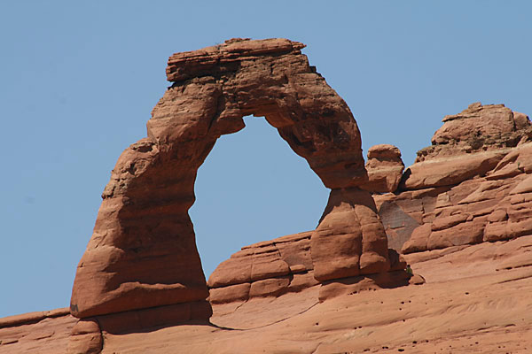 Vor der 3-Stunden-Wanderung über Slickrock zum Delicate Arch, dem Wahrzeichen von Utah, drücken wir uns. Es gibt einen kürzeren Weg, ihm recht nahe zu kommen - uns reichen auch zwanzig Minuten in praller Sonne steil bergauf. Zwar ist uns damit die klassische Perspektive Arch vor La Sal Mountains versagt, aber von dem Plateau aus, das wir erklommen haben, sieht er auch äußerst attraktiv aus, wie wir finden. Dass dieses Prachtstück nur eine Spannweite von nicht einmal 15 Metern hat, ist kaum zu glauben - vermutlich wirkt der Bogen nur deshalb so gigantisch, weil er völlig allein dasteht und aus dem Boden zu wachsen scheint.