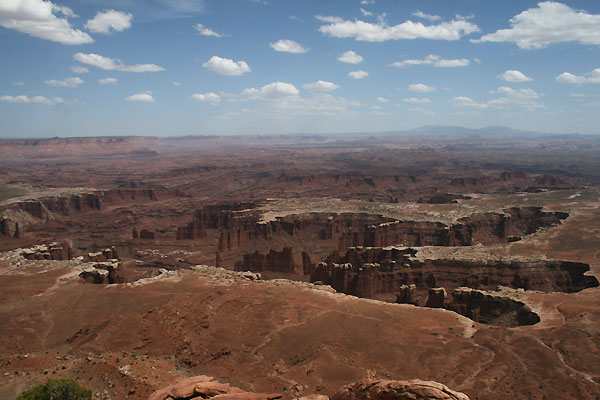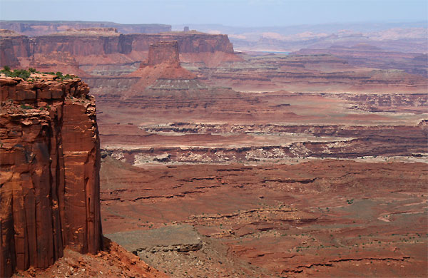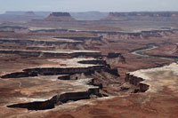 Die Landschaft mit ihren tiefen Narben, gewundenen Canyons und den smaragdfarben schimmernden Windungen des Green River ist grandios - selbst im zunehmend diffuser werdenden Licht. Wir genießen die Szenerie ja nur von ganz weit oben, dem Rand des allgegenwärtigen Colorado-Plateaus aus. Hinunter über die engen Serpentinen und Pisten können wir leider nicht mit unserem Toyota - das ist nur mit Geländewagen möglich.