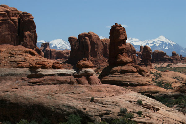 Die Vielfalt an Landschaftsformen und in Navajo-Sandstein gemeißelte Skulpturen ist schier unendlich. Neben den berühmten "Arches" in allen Varianten und Größen lassen sich bizarrste Formen und Skulpturen in allen Rottönen bestaunen, balancierende Felsen und ein riesiges Meer von versteinerten Dünen - und das alles vor der malerischen, verschneiten Kette der La Sal Mountains. Im Mai ist's hier noch erstaunlich grün, Blumen und Kakteenblüten sorgen für bunte Farbtupfer im roten Sand. Kein Wunder, dass dieser