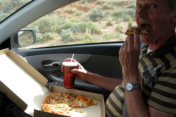 schon alle Stühle auf den Tischen stehen. Heute sinken wir so tief, dass wir in die Pizza Hut in Moab einfallen und uns gemäß American Way of Life zwei Schinken-ChampignonTeile, zum Verzehr für unterwegs hübsch in handliche Segmente geschnitten, auf die Fahrt mitnehmen - dazu zwei Monsterbecher Kaffee. So weit ist's gekommen. Dann fängt es irgendwann nach 40 Kilometern auch noch an zu regnen. Für den morgigen Trip zum Needles District der Canyonlands sieht's gar nicht gut aus. Aber wir wollen nicht unken - Wetterfrösche irren oft.