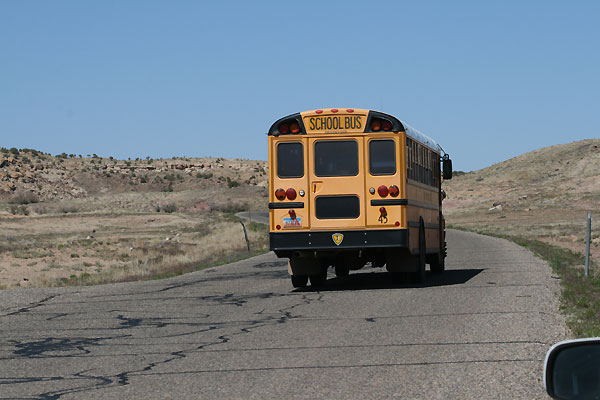 Wir beschließen, die schnellere Route via Four Corners und Highway außen vor zu lassen - außer einer eisernen Scheibe mit den Schnittstellen der vier Staaten Arizona, Colorado, Utah und New Mexico gibt's dort eh' nichts Aufregendes zu sehen. Stattdessen tuckern wir die verschlafene, kurvige Strecke via Hovenweep Monument nach Norden. Außer dem Schulbus, der mitten im Nichts zwei Kinder in die Wildnis entlässt, begegnen wir kaum einem Fahrzeug, hie und da grasen Pferde auf kargem Boden.