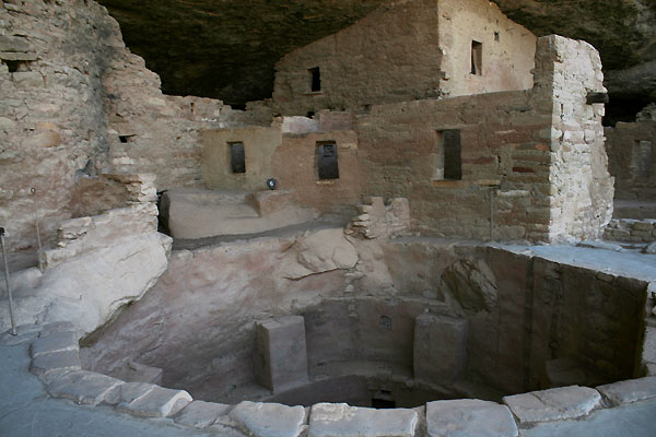 Unsere erste zum Sprucetree House, einem auf eigene Faust erkundbaren Felsenwohnungs-Komplex, gestalten wir mit zwei Stunden noch richtig großzügig. Wider Erwarten ist unten an der Ruine kein Mensch außer uns, nur ein Ranger, der bereitwillig alles Interessante über die Anlage erzählt. In die Kiva, den unterirdischen Versammlungsraum, dürfen wir ruhig hineinsteigen, meint er - aber vorsichtig! Dann wird's eng - gleich nach uns ergießt sich eine sechsköpfige französische Familie in die kleine Kammer und setzt sie gründlich unter Staub.