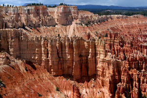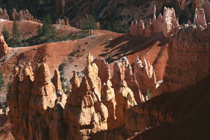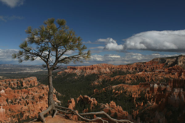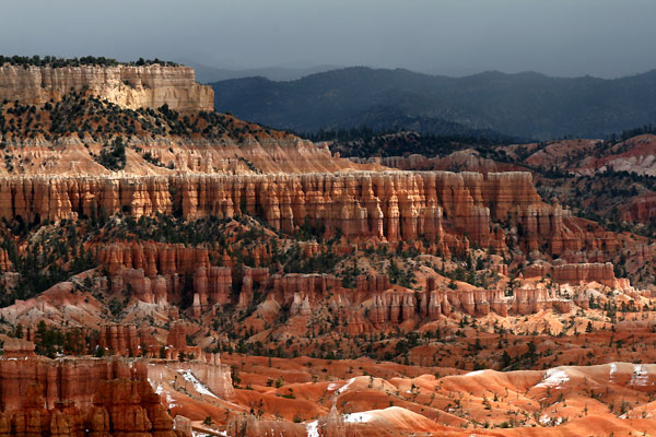 Oben am Rim in über 2.400 Metern Höhe fegt ein eisiger Wind, der uns nach längeren Märschen auf den exponierten Wegen bis in die Knochen geht. Wie das die Typen in ihren kurzen Hosen aushalten, ist uns schleierhaft - wir frieren. Entschädigt werden wir mit spektakulär ausgeleuchteter Kulisse, mal sonnendurchflutet, mal im Schatten dunkler Wolken. Eigentlich möchten wir einen der Trails hinunterwandern und ein wenig zwischen den Hoodoos umherlaufen. Aber wenn wir die Leute so angucken, die sich bis zu den Knien schlammverkrustet von unten wieder hochquälen, vergeht uns irgendwie die Lust dazu.