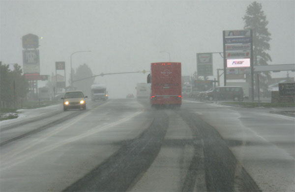 Der Morgen begrüßt uns mit fröhlichem Schneetreiben und Eiseskälte im Zimmer - besonders dicht ist die Bude nicht. Wir packen zusammen, werden es nochmal mit dem Canyon probieren, klappern die Parkstraße ab und verschwinden dann aus diesen Höhenlagen. Wir ziehen an, was unter unsere Jacken passt. Hans zwängt sich in zwei Hosen übereinander - Linda schafft das nicht.