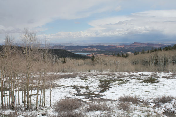 Der Scenic Byway 12 über Boulder hinunter nach Escalante ist befahrbar - und mit jedem Meter, den es bergab geht, schwindet der Schnee. Anderen Reisenden begegnen wir hier kaum, dafür jeder Menge am Straßenrand grasendem Mule Deer und - was wir eher mit Afrika assoziieren und hier am allerwenigsten erwartet hätten - einer Schar Ibisse in einem kleinen Tümpel. Hier wie in Afrika mögen sie es nicht besonders, wenn man stoppt um sie zu beobachten. Nach Escalante geht's in Richtung Bryce Canyon wieder bergauf, hinein in bedrohlich schwarze Wolken und schließlich einen Schneesturm kurz vor Tropic, unserem angepeilten Stützpunkt für den Besuch des Nationalparks. Ein ganz witziger Name für einen Gebirgsort in 2.200 Metern Höhe, wie wir finden, besonders an Tagen wie heute.