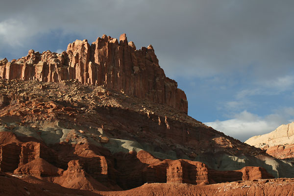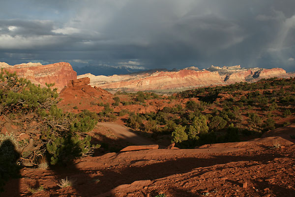 ersten Mal zwei Vertreter des weit verbreiteten "Mule Deer" aus nächster Nähe betrachten. Das absolute Highlight sind allerdings die Capitol-Reef-Bergketten in spätnachmittäglichem Licht, als sich letzte Sonnenstrahlen ihren Weg durch bedrohlich schwarze Unwetterwolken bahnen.
