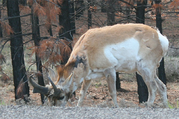 Einen kleinen Stau verursacht Linda kurz vorm Parkausgang, als sie sich gezwungen sieht, auf die Bremse zu treten und trotz Verbotsschildern und durchgehendem Strich seitlich zu stoppen. Am Straßenrand gegenüber grast ein Gabelbock, außer im TV haben wir solch ein Tier noch nicht gesehen. Nachkommende Fahrzeuge bleiben hinter uns ebenfalls stehen und Leute gucken. Not amused ist eindeutig der entgegenkommende Trampel von Jeepfahrer, der mit lautem Gehupe seinen Unmut bezüglich unseres infamen Fehlverhaltens kundtut und damit den Gabelbock verscheucht.