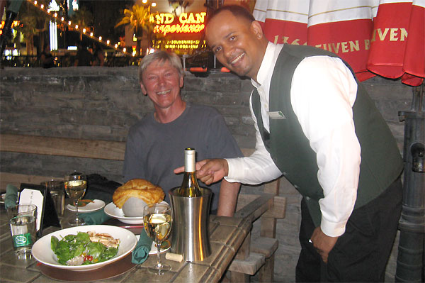 den Garten. Nachdem wir die merkwürdige Frage, wie wir hier hereingekommen sind, beantwortet haben, ernten wir einen skeptischen Blick, bekommen aber sofort einen Tisch. Unser letzter Abend hat sich ausgesprochen erfreulich entwickelt: Wir sitzen bei angenehmen Temperaturen im Freien, mitten im verrückten Wüstenstadtgetümmel, unser Waiter ist gut drauf und das Essen super - vor allem die überdimensionale irische Hühnerpastete von Hans, bei der er zunächst nicht weiß, wo er reinstechen soll.