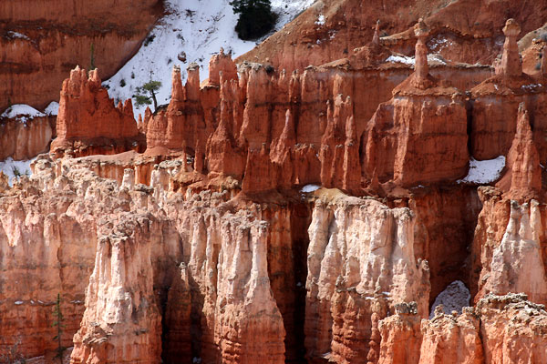 Tiefster Winter empfängt uns am fast 2.800 Meter hoch gelegenen Rainbow Point, dem Ende der Straße. Die Aussicht, so grandios sie ist, genießen wir nur kurz - nach zehn Minuten setzt heftiges Schneetreiben ein und wir flüchten. Es wird ohnehin Zeit, langsam aufzubrechen - es ist mittlerweile fast vier Uhr und wir wollen noch vor Zion ein Quartier finden.