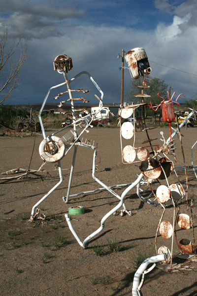 Hanksville erreichen wir kurz nach vier Uhr. Der Ort ist übersichtlich - eine Handvoll Häuser, zwei offenbar Motels, die uns aber nicht unbedingt zum Bleiben verleiten - wir fahren lieber weiter nach Torrey, Zeit genug haben wir ja. Sehr originell finden wir am Ortsende das Sammelsurium an Dinosauriern, die ein ortsansässiger Künstler aus Autoschrott, Rohren, Gewinden und anderen Eisenteilen erschaffen hat. Ein paar lustige Musiker stehen auch herum.