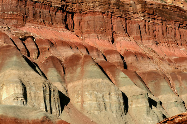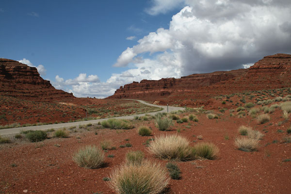 Die Fahrt auf der 95 durch diese grandiose Landschaft genießen wir dagegen in vollen Zügen. Die Straße schlängelt sich durch weite von Tafelbergen gesäumte Täler, entlang des White Canyon - tiefe Einblicke in gewaltige Schluchten inklusive - und über flache, in knallroten Sandstein gekerbte Pässe. Der stetige Wechsel zwischen Sonne und sich düster zusammenballenden Wolkenbergen taucht die Szenerie um
