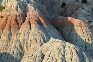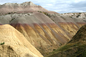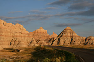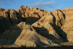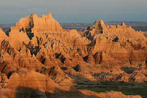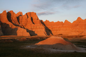 Für die Bezeichnung "schlechtes Land" haben wir schon Verständnis, aber als Vertreter der Gattung Tourist sind wir einfach nur hingerissen von der Kulisse aus Türmchen, Canyons, scharfkantigen Graten, Wänden, die wie Kathedralen emporragen, weich gerundeten, in die Prairie hineinfließenden Formationen. Als Einheit betrachtet, wirken die Badlands eher grau; ihre aparten, waagerecht verlaufenden Schichten, besonders die in allen möglichen Rottönen, kommen dafür bei bestimmten Lichtverhältnissen umso eindrucksvoller zur Geltung: bei schräg einfallendem Licht oder einem Sonnenloch vor dunklem Himmel (schlecht bei strahlendem Sonnenschein, kompletter Bewölkung oder zu Mittag).