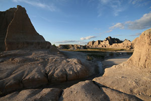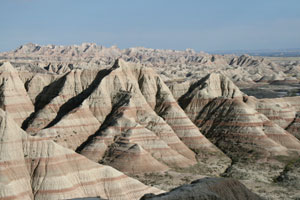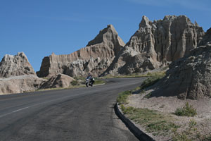 Bis vor 75 Millionen Jahren war dieser Teil Nordamerikas von einem seichten Ozean bedeckt, der abfloss, als sich die pazifische Platte unter die nordamerikanische schob und die Landmasse hier allmählich anhob. Nach einer Ära subtropischen Klimas und Überfluss an Flora und Fauna setzte ein Klimawandel ein, das Land trocknete aus. Bäume und andere Pflanzen verschwanden, zurück blieb eine Ebene durchlässigen Bodens, auf dem nur noch Gräser gedeihen konnten - die Prärie. Wind, Regen, Hitze und Frost konnten sich hier nun ungehindert austoben, sukzessive die Sedimente des ehemaligen Meeres freilegen und die Landschaft erschaffen, durch die wir jetzt düsen - Badlands.