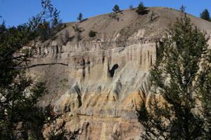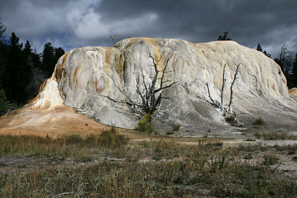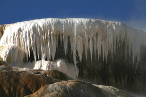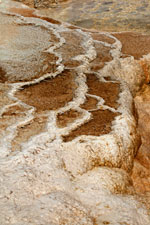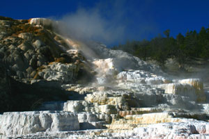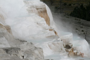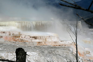 Die Mammoth Terraces, eine fantastische Landschaft aus Travertin-Kaskaden in allen Formen, Größen und Farben, sind unser erstes Ziel. Hier sammelt sich Wasser aus den umliegenden Bergen im Kalksteinuntergrund, wird dort erhitzt, tritt mitsamt Lösungsstoffen durch kleine Spalten an die Oberfläche, und bildet nach und nach Sinter-Terrassen aus - von Swimmingpool-großen bis hin zu ganz filigranen im Fingerhutformat. Die unterschiedlichen Farben - hier wie auch bei allen anderen hydrothermalen Erscheinungsformen in Yellowstone - markieren diverse hier