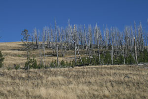 Welch verheerendes Ausmaß hiesige Waldbrände haben, zeigt sich am Dunraven Pass. So weit das Auge reicht,
