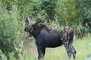 Der erste Ausnahmefall für Stopps tritt schon ein paar Meilen vor der Parkgrenze ein: Unterhalb der Straße steht tatsächlich ein Elch, nicht gerade der kapitalste mit dem