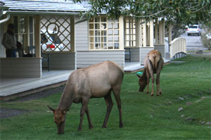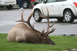 Beim Einchecken noch nicht anwesend, hat sich zwischenzeitlich ein Wapiti-Hirsch (bzw. "Elk" - die Elche heißen hier "Moose") vor der Rezeption niedergelassen. Ein Ranger sorgt mit Nachdruck dafür, dass zwischen den Schaulustigen vorm Hotel, auf der Straße und dem Parkplatz zu ihm eine