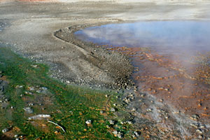ansässige, hitzeresistente Bakterienkolonien, Thermophile. Die in Rot bis Orange mögen's heiß, die in Grün und Blau bevorzugen gemäßigtere Temperaturen. Alles befindet sich in einem steten Wandel - neue Terrassen entstehen durch aus neuen Spalten austretende Quellen, bestehende Kaskaden trocknen aus, entsprechend ändern sich im Laufe der Zeit und auch eines Jahres vorherrschende Farben bzw. Bakterienvorkommen.