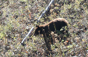 beobachten, wie er an Sträuchern zupft oder auf einem umgestürzten Baum balanciert. Ein richtig launiger Anblick - wir können uns erst losreißen, als das Bärchen im Schatten und zwischen den Bäumen hangaufwärts verschwindet.